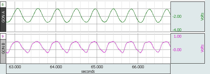 The BioNomadix two channel wireless goniometry amplifier is a dual output device that provide simultaneous measurements around two orthogonal rotational axes (e.g., wrist flexion/extension and radial/ulnar deviations). These units interface with the MP200 (or older MP160/MP150) data acquisition and analysis platform and AcqKnowledge software, allowing advanced analysis for multiple applications and supporting acquisition of a broad range of signals and measurements.