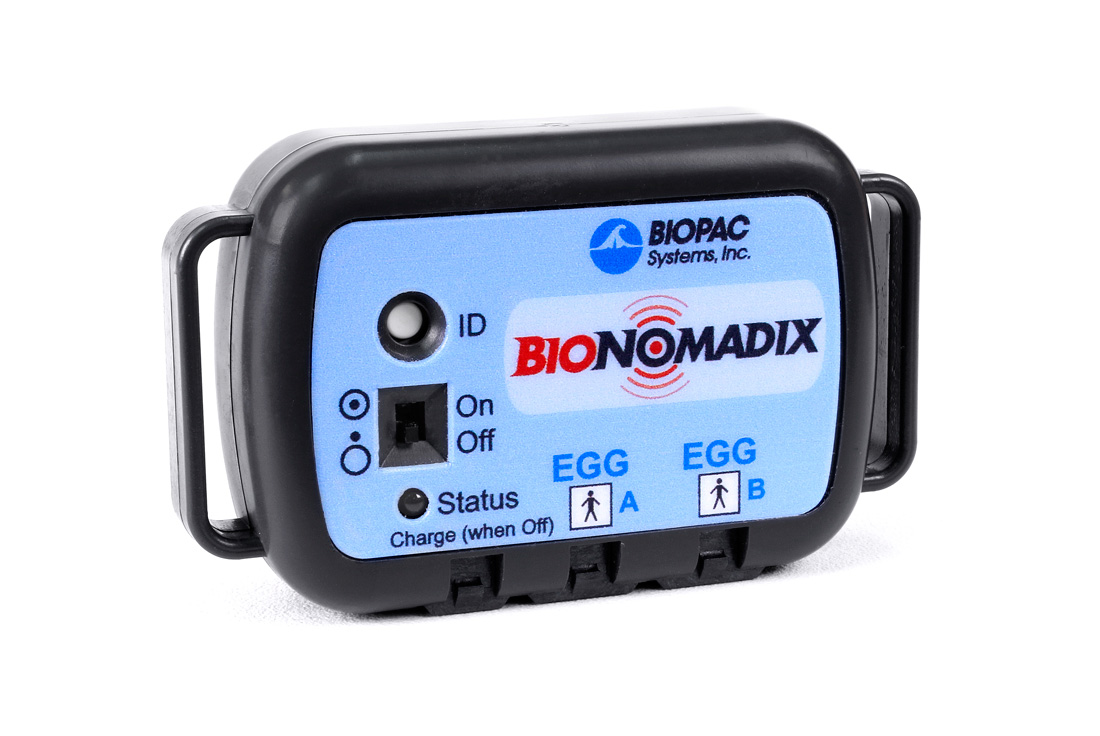 The Dual Wireless EGG BioNomadix Transmitter is a module specifically designed to measure Electrogastrogram (EGG) data—the peristaltic, wavelike contractions of the stomach—on one or both channels. Using AcqKnowledge, wide bandwidth EGG data can be filtered to lower values to accommodate closer inspection of specific EGG frequencies, such as Bradygastria, Normogastria and Tachygastria or identification of ECA and ERA. To extract a bipolar measurement between two unipolar measurements referenced to a common abdominal electrode site, use the equation generator in AcqKnowledge.