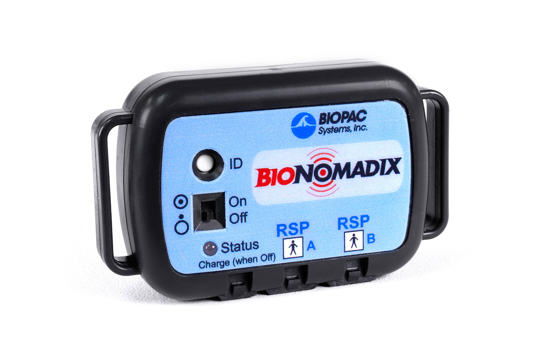 The Dual Wireless Respiration BioNomadix Transmitter is specifically designed to measure respiratory effort associated with circumferential changes in the thoracic or abdominal regions of the torso. The BioNomadix setup establishes a fixed wideband response of DC to 10 Hz for monitoring extremely rapid respiratory effort variations (up to 600 breaths per minute) associated with coughing or sneezing, or measuring relatively static respiratory conditions, such as cessation of breathing. Additional internal highpass and lowpass optional filters provide for high quality amplification of respiratory effort signals even during periods of vigorous exercise or activity.