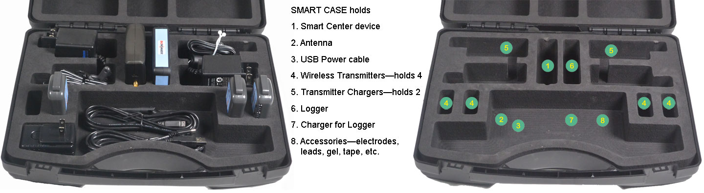 - Smart Center Essentials entry-level system includes a Smart Center Device (BN-SMART with USB power cable), 2 or 3 Transmitters (BN-xxx-T with chargers); AcqKnowledge for Smart Center, and a case.