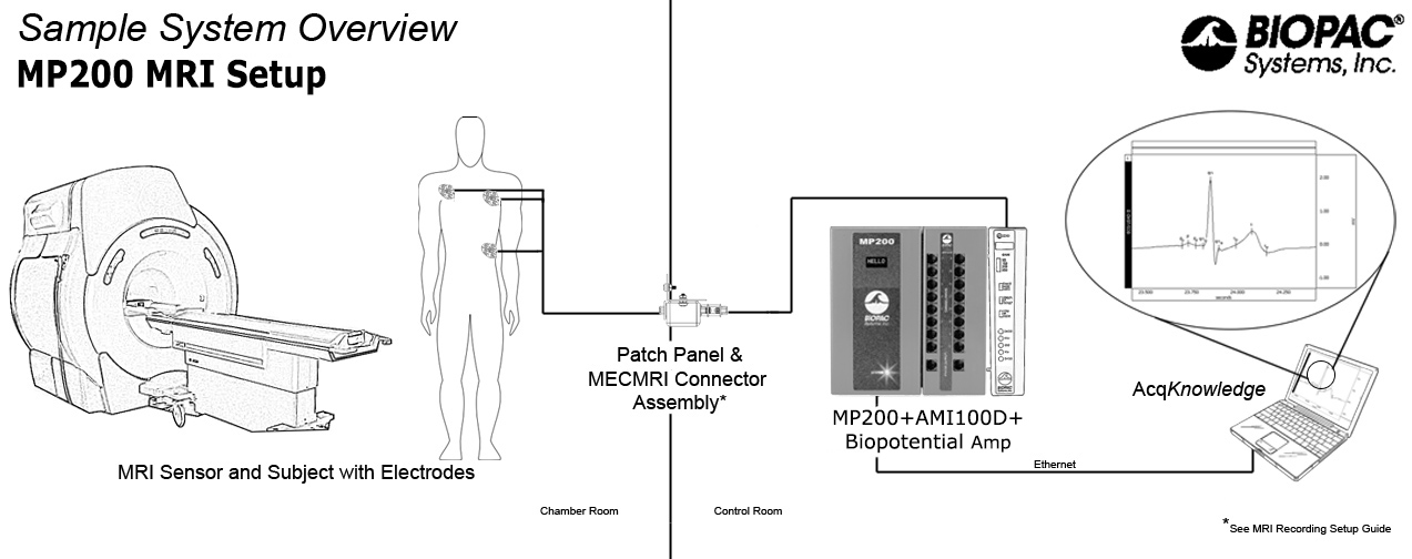 The EDA100C-MRI amplifier should be used with the MECMRI-TRANS MRI cable/filter set. The EDA100C-MRI is part of a complete research system, interfacing with the MP200/MP200 data acquisition and analysis platform and AcqKnowledge software, allowing advanced analysis for multiple applications and supporting acquisition of a broad range of signals and measurements.