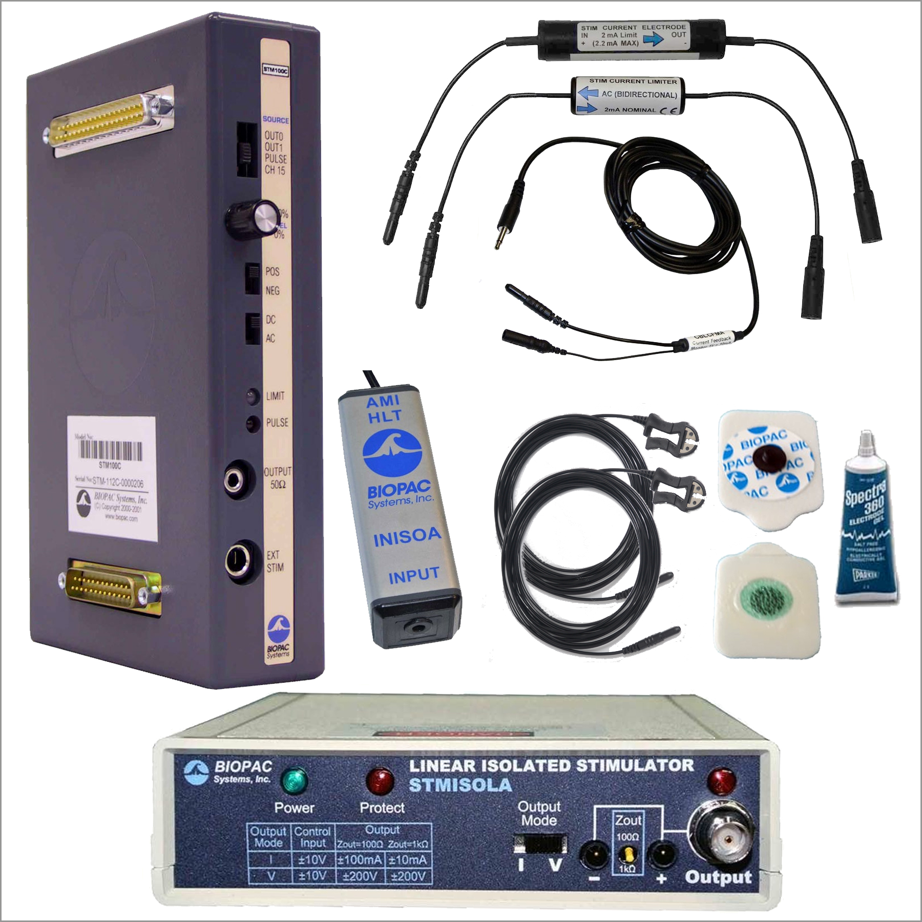 This package includes everything required to deliver constant current and constant voltage electrical stimulation with an existing MP200 System with AcqKnowledge for a variety of applications, including: muscle stimulation, nerve stimulation (e.g., H-reflex), shock and pain paradigms, transcranial direct current (tDCS) and transcranial alternating current stimulation (tACS).