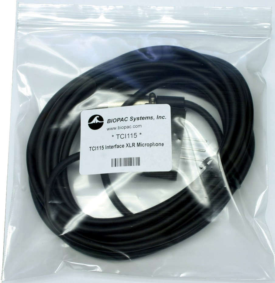 Use TCI115 to interface standard, dynamic XLR microphones to the BIOPAC DA100C for use with a Research System. The TCI115 will operate with a balanced (differential output) or unbalanced (single-ended output) XLR microphone, and accommodates a six meter XLR microphone cable. Input signal level maximum is 400 mv (p-p). The DA100C connection permits a bandwidth from DC-5000 Hz (contact BIOPAC to discuss customization if required).