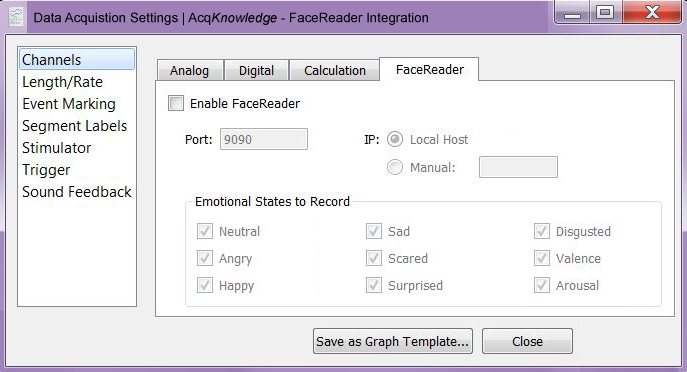 - FaceReader locks onto a subject’s face and analyzes facial movements to classify subject’s response. Easily integrate with physiological parameters from an MP200 Research System or eye tracking data. When you start AcqKnowledge to begin recording, FaceReader data is automatically synchronized and recorded in the same graph file. Monitor data in the FaceReader display for real-time feedback.