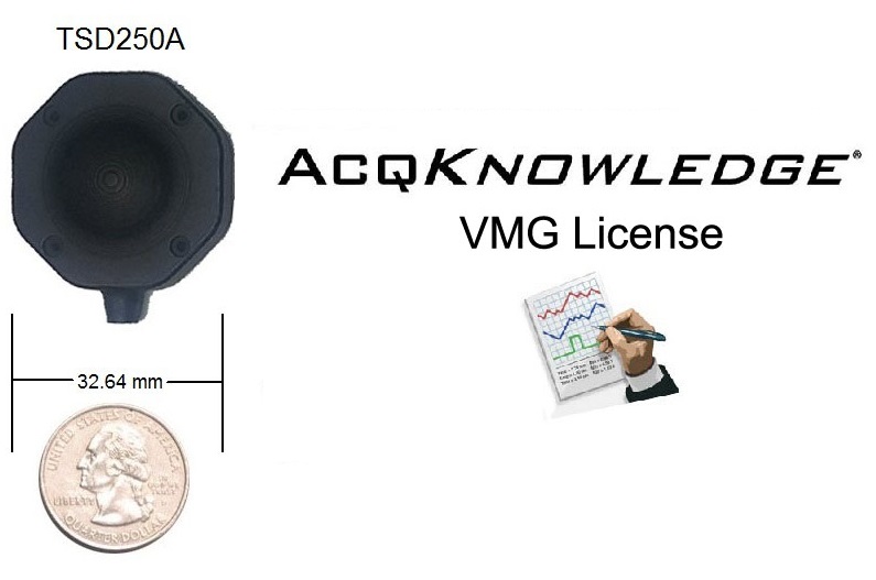 This pack includes one TSD250A VMG transducer and AcqKnowledge software VMG License for use with an MP200 or MP36R data acquisition system running current release software. VMG software is optimized for the TSD250A and BIOPAC will not support or guarantee the performance of third-party transducers. The pack provides sensitive microelectromechanical (MEMS) accelerometers and advanced signal analysis algorithms to monitor muscle vibration. The technique allows researchers to study muscle performance and strength balance.